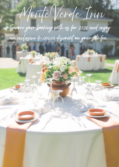 Monte Verde Inn offers various all inclusive packages for couples. With only one event per day and the services for all couples include: Full private use of the venue, complimentary getting ready suites, complete set up and break down of round dinner tables & white folding chairs, assorted votives and tea light candles for table decor, flatware, glassware & stemware. In addition, to professional coordination throughout the planning process, day of coordination and a one hour rehearsal with wedding party the day before your wedding.